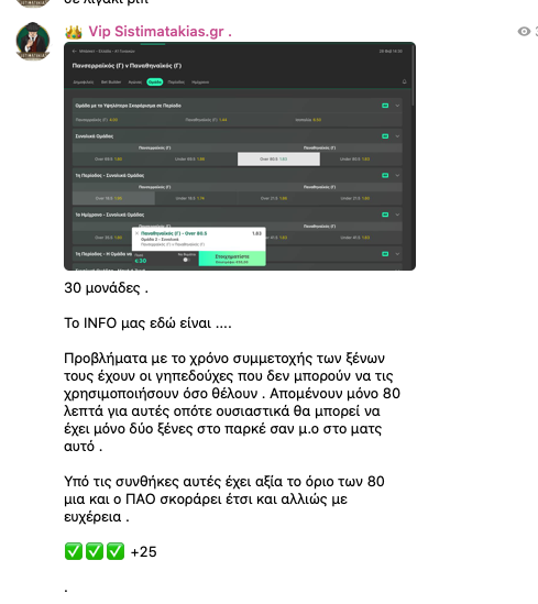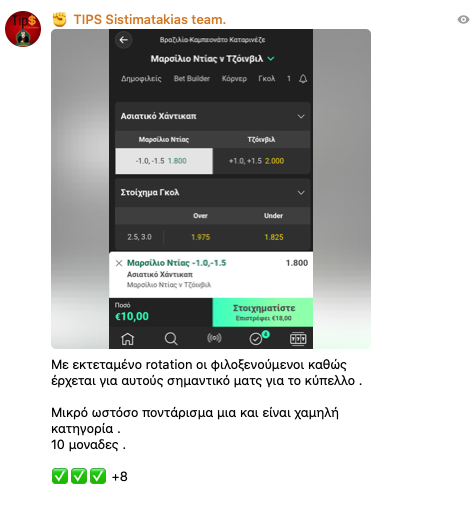 Να αναφέρω όσοι φίλοι του site δεν είστε στο free μας τελεγραμ μπορείτε να κλικάρετε τον σύνδεσμο και να ενημερώνεστε άμεσα με free επιλογές σε bet builders , συστηματάκια αλλά και μονά μονά αποδεκτά κυρίως σε live bets. Συνήθως πηγαίνουμε με υψηλές αποδόσεις …