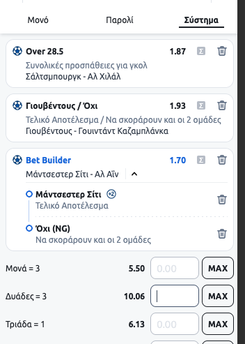 Tις τρεις αυτες επιλογές θα τις κάνω ένα σύστημα όπους θα ζητώ δυάδες , είναι τρεις στήλες , με δυαδα έχω μικρό κέρδος επιθυμητής είναι το απόλυτο ..