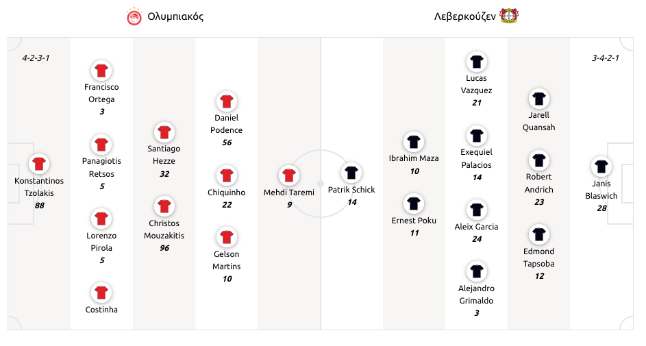 Το σημερινό παιχνίδι είναι εντελώς διαφορετικό από εκείνο πριν περίπου ένα μήνα για την league phase όπου ο Ολυμπιακός επικράτησε στο Καραϊσκάκης με 2-0 της Λεβερκούζεν η οποία έιχε έρθει τότε με πολλές απουσίες και είχε χάσει και κάμποσες καλές ευκαιρίες για να σκοράρει και αυτή . Ο Ολυμπιακός είχε αιφνιδιάσει τους Γερμανούς τότε σκοράροντας στο 2′ (!), διπλασιάζοντας τα τέρματα του με την λήξη του πρώτυ ημιχρόνου .. και κόντρα στην ροή του ματς με την Λεμερκούζεν να χάνει κλσικές εθκαιρίες και τον κίπερ Τζολάκη να κάνει σωτήριες αποκρούσεις .