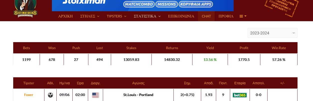 ΕΔΩ ΝΑ ΑΝΑΦΕΡΩ ΌΤΙ ΣΤΗΝ ΣΤΗΛΗ ΑΥΤΗ ΤΑ ΠΡΟΓΝΩΣΤΙΚΑ ΤΟΥ sistimatakias ξεπερνούν το 30% yield σε πάνω πό 360 (!) πικς, ΕΚΚΩΦΑΝΤΙΚΌ ΠΟΣΟΣΤΌ ΠΟΥ ΔΕΝ ΘΑ ΒΡΕΙΤΕ ΣΤΟΝ Ελλαδικο χώρο να έχει κάποιος αν έχει δωσει μεγαλο αριθμό picks και να κρατά τίμια μπανκα !